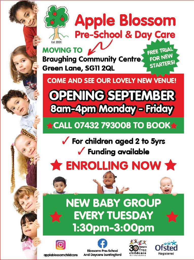 Apple Blossom Pre-school & Daycare based in Buntingford will be moving to the beautiful village of Braughing in September!