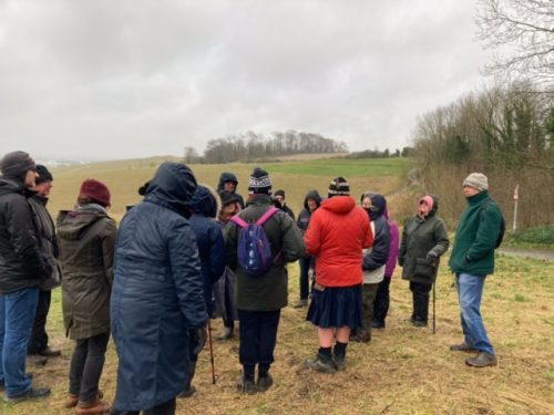 A hardy group of twenty five people led by Keith Fitzpatrick-Matthews, archaeologist and curator of Hitchin Museum, walked the Barrows of Therfield Heath. It was cold, wet and windy but Keith made our walk so fascinating it didn’t matter! There is one neolithic long barrow and a number of bronze age round barrows on the Heath. Keith explained the findings from the archaeological digs and the types of burials at different periods. We were shown evidence of ancient tracks that crossed the Heath and ridges showing areas that were farmed to produce food during the Napoleonic wars. He also told us about a recent LIDAR survey which has shown up many more features in the landscape that archaeologists are examining. Keith explained the current thoughts on the mile ditches and much, much, more.