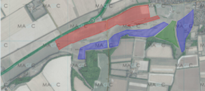 Having conducted a survey previously, we found ground-nesting birds almost everywhere across the site, but that some areas have higher densities than others. So you know where these areas are, we have produced a map. The red areas on the map (mostly downhill of the chalk track) show where the highest density were found, the blue are intermediate and the green area is where the lowest density were found.